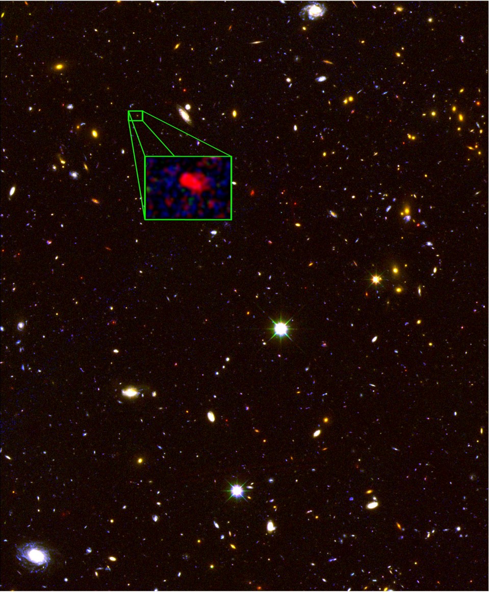 No início, era a escuridão. Após o Big Bang, que criou as coisas como as conhecemos hoje, há 13.800 milhões de anos, o Universo passou por uma “era negra”: banhado por uma sopa tão densa e quente de protões, electrões e fotões, era opaco e não deixava a luz viajar livremente. Mas quando os protões e os electrões se juntaram, formando átomos de hidrogénio, a luz (fotões) pôde passar e o Universo, aos 380 mil anos de idade, começou a tornar-se transparente. Não tardou muito, formaram-se as primeiras estrelas e galáxias, ilhas de matéria compostas por biliões e biliões de estrelas – e é agora uma dessas galáxias muito antigas, quando o Universo era um adolescente de 700 mil anos, que conseguimos ver.