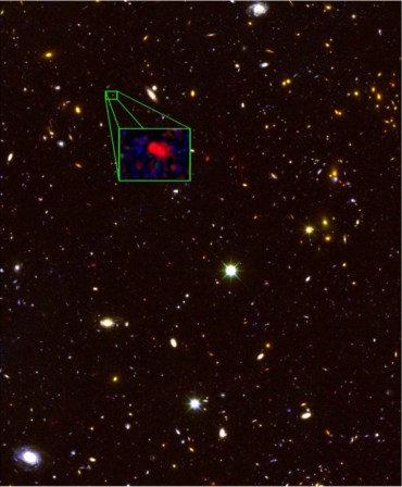 Este vislumbre do início dos tempos, quase como se espreitássemos pela fresta de uma porta, traz até nós a galáxia mais distante – logo, mais antiga – já vista até agora. Ou, dito de outra forma, leva-nos numa viagem até aos primórdios do Universo (quanto mais longe se olha no Universo, mais se recua no tempo). Tudo graças às observações de telescópios cá em baixo, no solo, e lá em cima, no espaço: o Keck I, no Havai, e o Hubble, respectivamente.